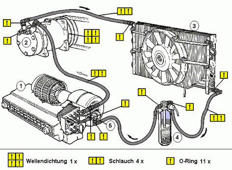 Figure shows the major sources of refrigerant leaks according to car manufacturers. At most 10 to 30 gr of refrigerant loss from the compressor shaft is widely accepted to be inevitable. 42 to 83 gr of refrigerant loss (10 to 20 gr from the hose system, 2 to 3 gr from each o-ring) is accepted to be “normal” for every year of operation.